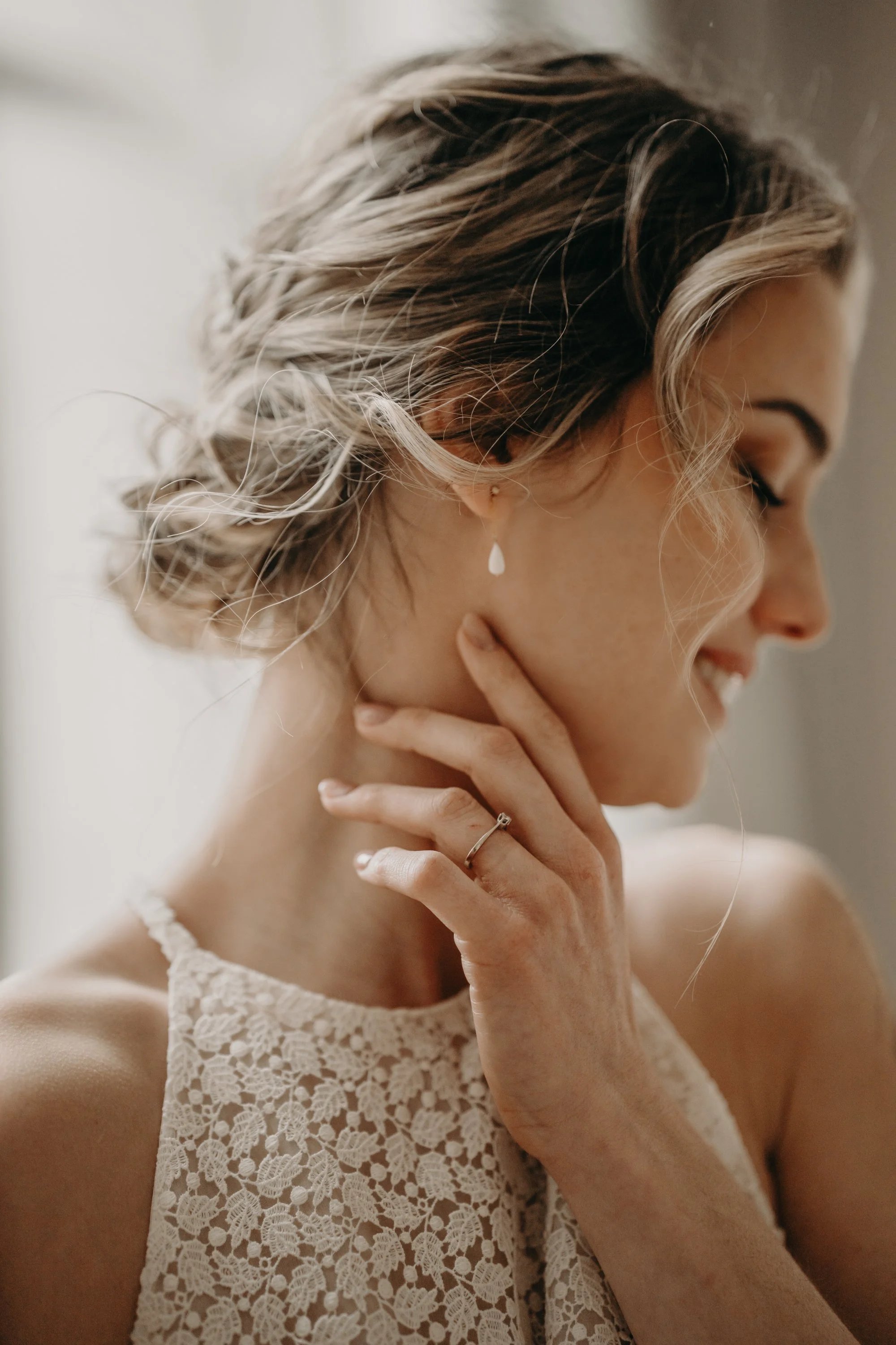 Une délicate larme façonnée à la main, suspendue à une fine chaîne dorée. Discrète et raffinée, elle apporte une touche subtile qui révèle toute la finesse et l’élégance de votre look de mariée.