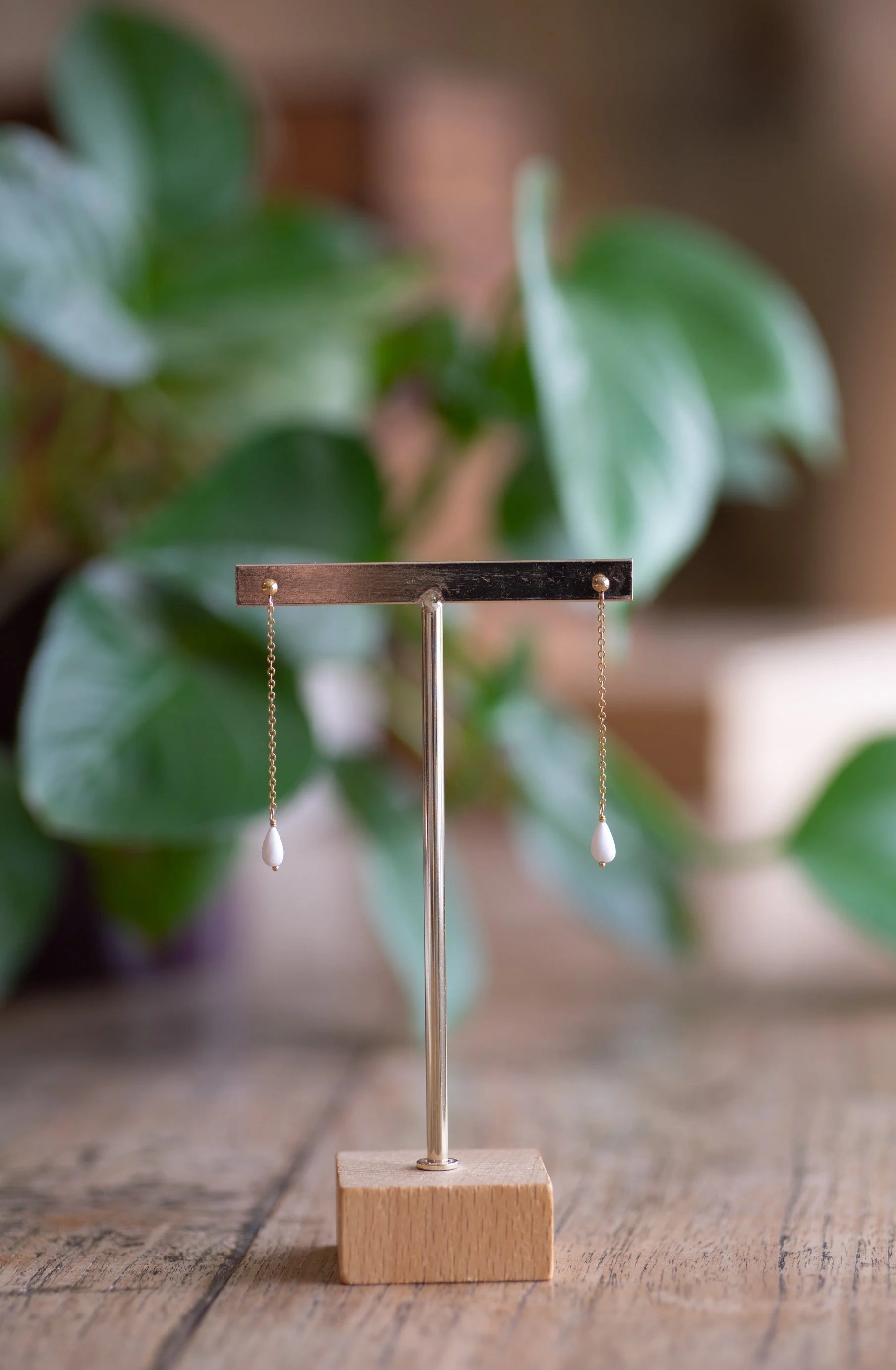 Une larme délicate façonnée en porcelaine et suspendue à une longue chaîne dorée. Légèrement décontractée et aérienne, elle diffuse une subtile luminosité et apporte une touche de raffinement, sublimant avec élégance votre look de mariée.
